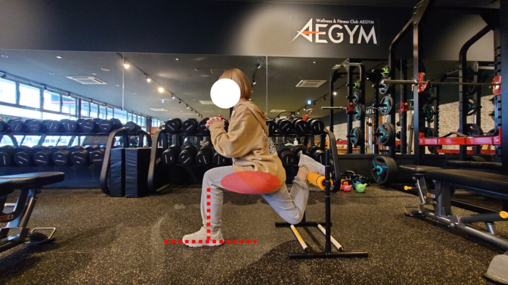 ひざがつま先よりも前に出ると大腿四頭筋メインのブルガリアンスクワットになってしまうので、膝の位置にも気を付けてみてください。