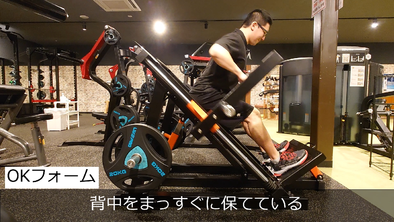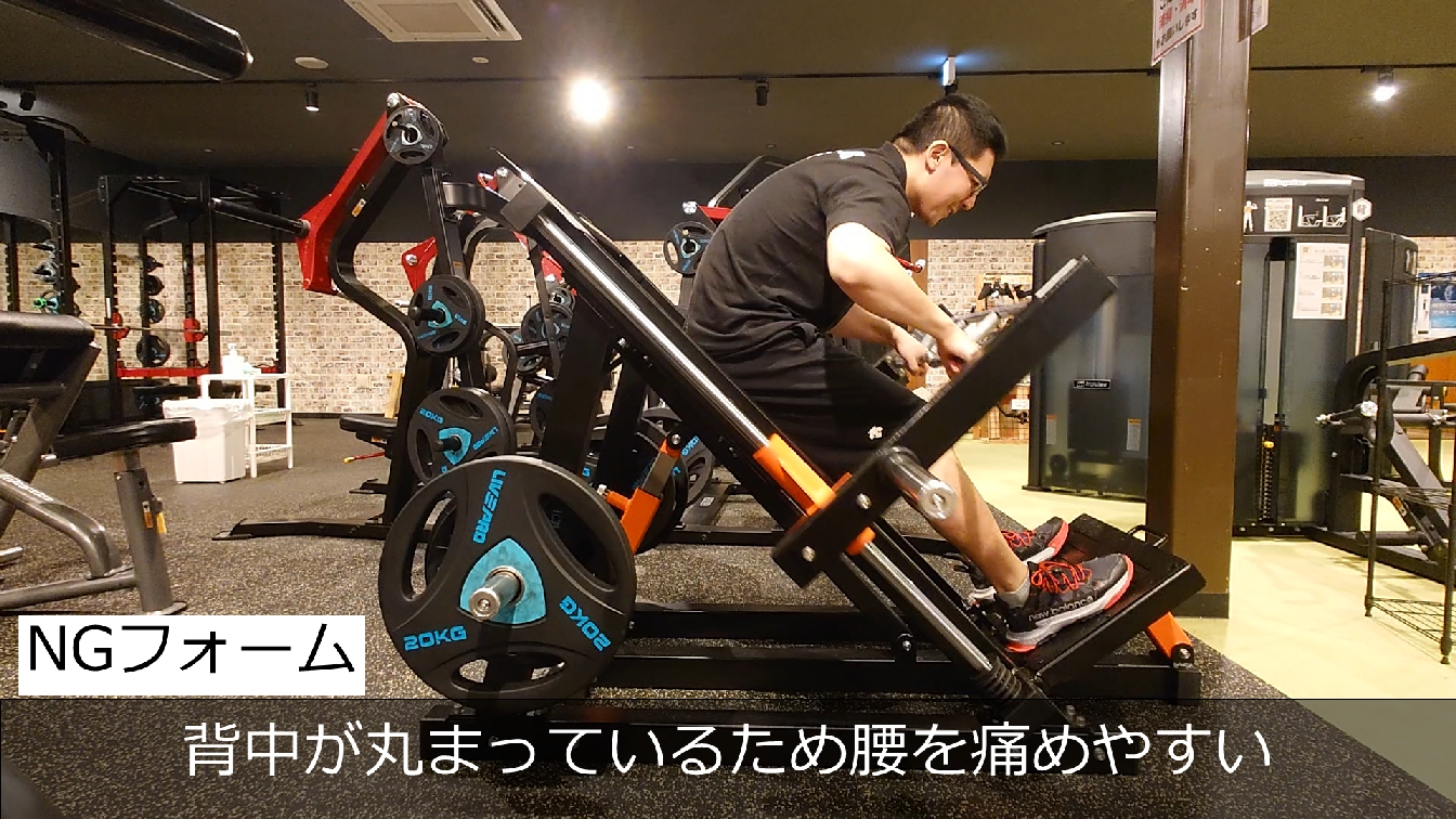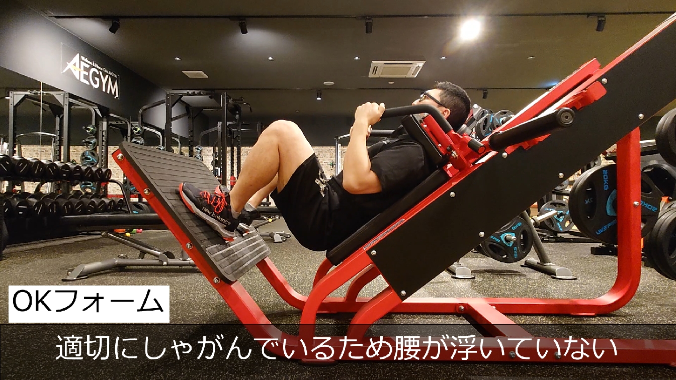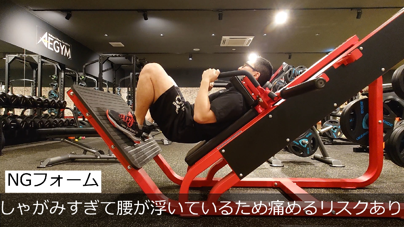 ハックスクワットはかなり下までしゃがめるマシンですが、しゃがみすぎはNG!